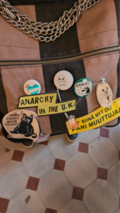 Minulla ei ole mitään selkeää suosikkipinssiä. Olen tehnyt pinssejä paljon itse, mutta osan olen löytänyt kotoa tai ostanut. Moni pinssini tukee omia arvojani ja haenkin usein pinssejä, jotka ovat hauskoja ja omia arvojani tukevia.