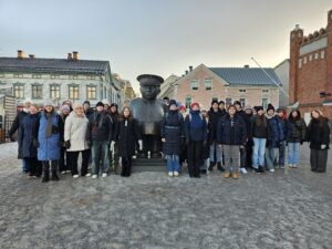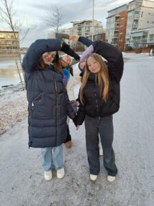Lounaan jälkeen lähdimme käymään Oulun taidemuseolla. Museossa osallistuimme opastetulle kierrokselle, jonka meille piti ihana työntekijä. Ensimmäiseksi saimme ihastella videomuotoista taideteosta värikkäillä tyynyillä istuen. Seuraavaksi kiertelimme näyttelyä, jossa pääsimme muun muassa musisoimaan sekä kurkistamaan nurkassa olevaan majaan. Museokierros päättyi pimeään huoneeseen, jossa vain metsä ja taustaäänet ympäröivät meitä. Taideteoksen tekijä oli nauhoittanut monta tuntia hiljaa istuen, napaten kaikki ympäristön äänet. Tunnelma oli jopa hieman pelottava, mutta kaikkiaan museoretki oli upea kokemus! Museosta jatkoimme matkaa vielä Hupisaarilla sijaitsevien Oulu-kirjaimien luokse ottamaan yhteiskuvan. Tämän jälkeen kaikki lähtivät omille teilleen.