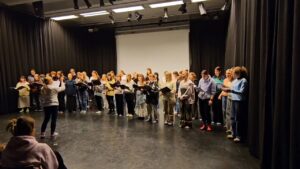 Kokoonnuimme kaikki yhdessä draamasaliin. Paikalla olivat kaikki, jotka olivat olleet projektissa mukana, joten myös monen majoittajan kotiväki oli tullut paikalle.